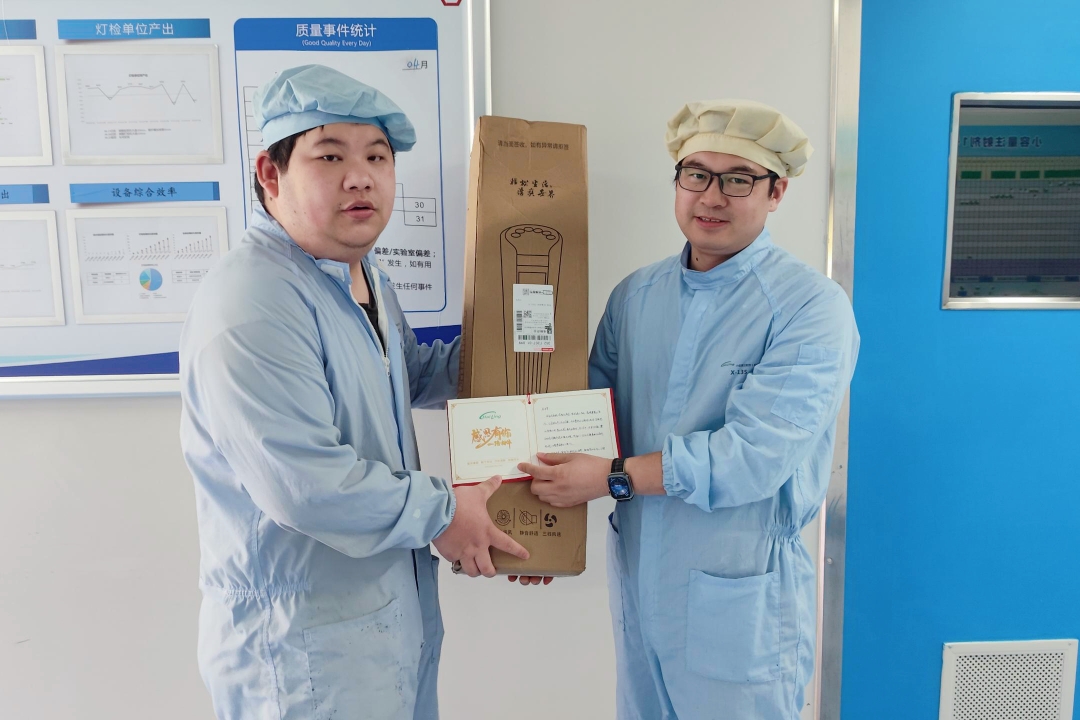 感謝卡:進(jìn)入車間的你,最開始被安排在燈檢學(xué)習(xí),燈檢機(jī)操作技能、人工燈檢學(xué)習(xí),任務(wù)緊,但你并沒有產(chǎn)生畏懼之心,一點(diǎn)一點(diǎn)的學(xué)習(xí)。是你的努力讓你快速取得上崗資質(zhì)。在崗工作時(shí),更是嚴(yán)格把控產(chǎn)品質(zhì)量?!笆墙鹱釉谀亩紩?huì)發(fā)光”,正是因?yàn)槟銉?yōu)異的表現(xiàn),將你調(diào)整至灌封學(xué)習(xí),對(duì)于無(wú)菌控制關(guān)鍵崗位,更需要做到120%的細(xì)心,做好每一個(gè)細(xì)節(jié)管控。現(xiàn)在的你又轉(zhuǎn)至洗烘學(xué)習(xí),希望你再接再勵(lì),扎實(shí)認(rèn)真學(xué)習(xí),擁有多項(xiàng)技能,成為車間“多面手”。