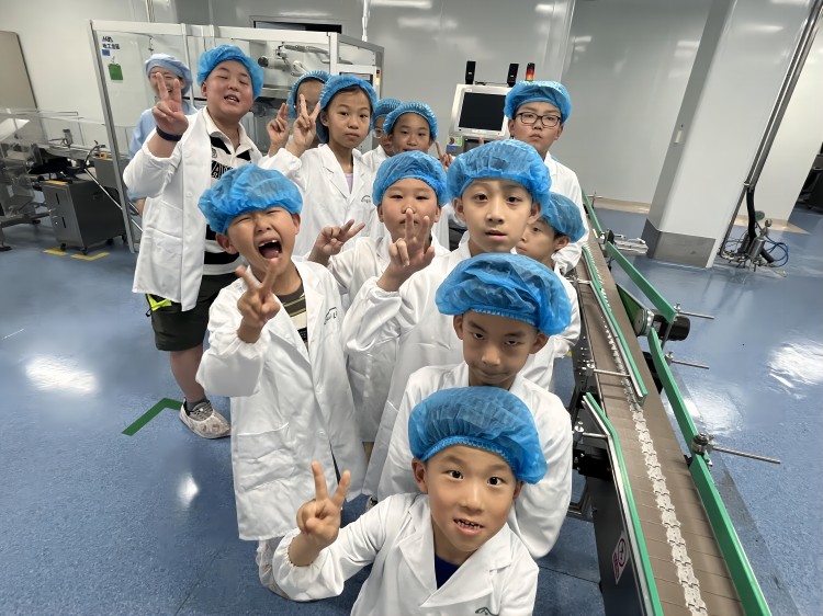 緊接著孩子們來到了小容量注射劑1號車間。在進入生產(chǎn)區(qū)的剎那,透過巨大的玻璃展窗,孩子們發(fā)出陣陣驚嘆——儲水罐猶如高大威猛的巨人,佇立在光亮整潔的制水間內(nèi)。注射液的誕生之路便從這里開始。在滅菌間內(nèi),孩子們對巨大的鐵柜子充滿了好奇,它就是飽和蒸汽滅菌柜,是藥支“蒸桑拿”的地方。孩子們在這里學(xué)習(xí)到了溫度與微生物之間的親密關(guān)系。在燈檢間內(nèi),巨大的星輪圓盤與隊列整齊的藥支們訴說著質(zhì)量第一的故事。最后,在包裝間內(nèi),從分托入托機到裝箱機,藥支們陸續(xù)穿上漂亮的服裝,成功誕生為完整的產(chǎn)品。孩子們了解到,每一支注射劑的誕生,都是科技與智慧的結(jié)晶,是保護人類健康的超級英雄。