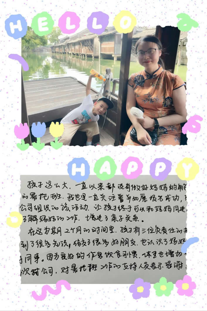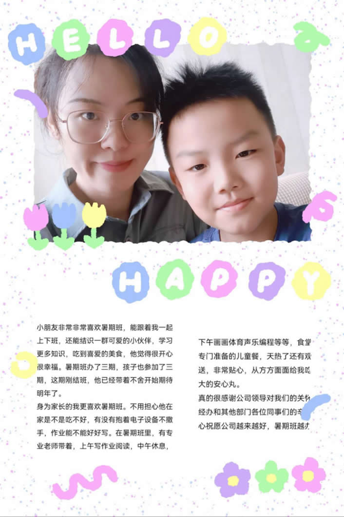 (片段)在這為期2個月的時間里,孩子有三位負責任的老師,學到了很多知識,結交了很多好朋友,也認識了媽媽許多好同事。因為良好的作息飲食習慣,體重也增加了不少。再次對公司、對暑托班工作的支持人員表示感謝!