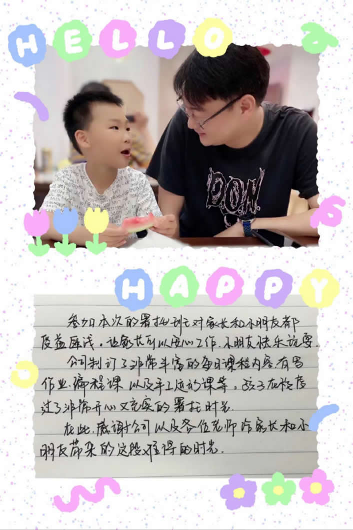 參加本次的暑托班對家長和小朋友都受益匪淺,讓家長可以安心工作,小朋友快樂玩耍。公司制訂了非常豐富的每日課程內容,有寫作業(yè)、編程課以及手工運動課等。孩子在校度過了非常開心又充實的暑托時光。在此,感謝公司以及各位老師給家長和小朋友帶來的這段難得的時光。